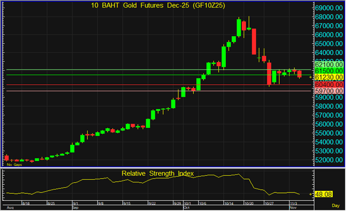 เช้านี้ราคา GF10Z25 อาจฟื้นตัวขึ้นอีกครั้ง แต่ประเมินว่าอาจเป็นเพียงการฟื้นตัวสั้นๆ จึงแนะนำรอเปิด Short จากแนวต้านที่ระดับ 61,500 บาท โดยมีเป้าหมายทำกำไรที่ระดับ 60,400 บาท และตัดขาดทุนหากราคาทะลุแนวต้านที่ระดับ 62,100 บาทขึ้นไป