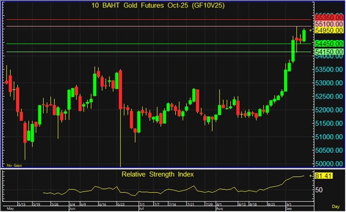 แม้ราคาจะเร่งตัวขึ้นมา แต่ในช่วงเช้าราคา GF10V25 ยังคงไม่สามารถผ่านแนวต้านขึ้นไปได้ จึงแนะนำรอเปิด Short จากแนวต้านที่ระดับ 55,100 บาท โดยมีเป้าหมายทำกำไรที่ระดับ 54,450 บาท และตัดขาดทุนหากราคาทะลุแนวต้านแรกที่ระดับ 55,350 บาทขึ้นไป