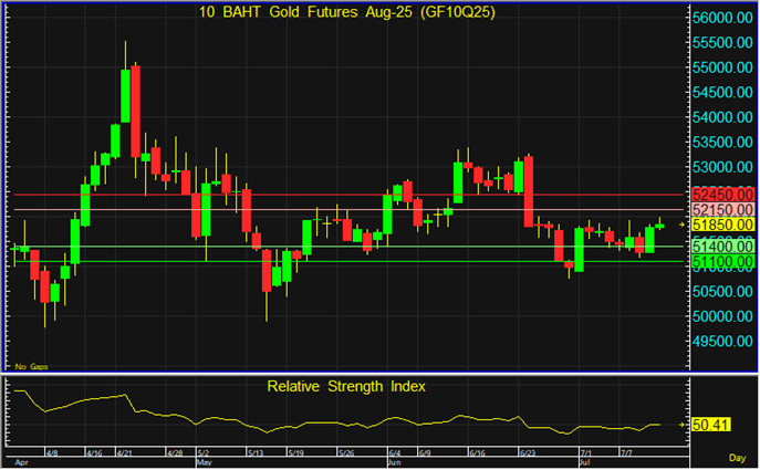 GF10Q25 ที่ฟื้นตัวขึ้นมาในช่วงเช้า เริ่มเผชิญแรงขายจากแนวต้านสำคัญ จึงแนะนำรอเปิด Short จากแนวต้านที่ระดับ 52,150 บาท โดยมีเป้าหมายทำกำไรที่ 51,400 บาท และตัดขาดทุนหากราคาทะลุแนวต้านที่ระดับ 52,450 บาทขึ้นไป