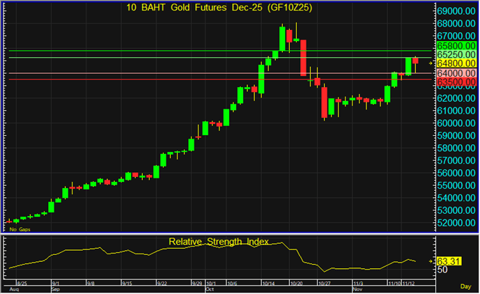 ราคา GF10Z25 เริ่มเผชิญแรงขายอีกครั้ง จากแนวต้านสำคัญที่ระดับ 65,250 บาท จึงแนะนำรอเปิด Short จากแนวต้านดังกล่าว โดยมีเป้าทำกำไรที่ระดับ 64,000 บาท และตัดขาดทุนหากราคาทะลุแนวต้านที่ระดับ 65,800 บาทขึ้นไป