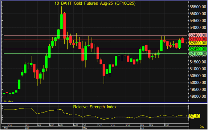 แม้ราคา GF10Q25 มีแนวโน้มปรับฐานลงในระยะสั้น แต่แนวรับที่ 52,450 บาท เป็นแนวรับสำคัญซึ่งอาจส่งราคาฟื้นตัวกลับจากแนวรับดังกล่าวได้ จึงแนะนำรอเปิด Long จากแนวรับดังกล่าว โดยมีเป้าหมายทำกำไรที่ 53,100 บาท และตัดขาดทุนหากทะลุแนวรับที่ระดับ 52,100 บาทลงไป