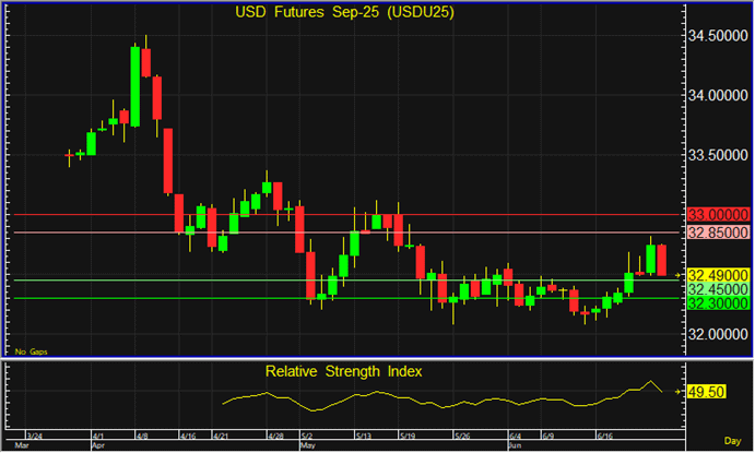 USDU25 ที่ฟื้นตัวขึ้นมา ยังคงเผชิญแรงขายจากแนวต้านที่ระดับ 32.85 บาท แต่หลังราคาลงทดสอบแนวรับที่ 32.45 บาทเริ่มมีแรงซื้อ