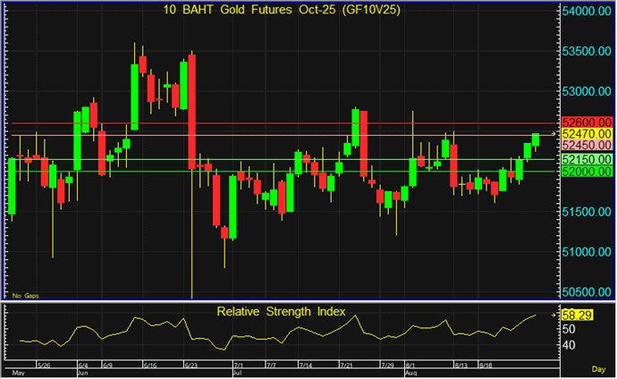 ราคา GF10V25 เริ่มปรับฐานลงในช่วงเช้า แต่ยังคงแนะนำรอเปิด Short จากแนวต้านที่ระดับ 52,450 บาท โดยมีเป้าหมายทำกำไรที่ระดับ 52,150 บาท และตัดขาดทุนหากราคาทะลุแนวต้านที่ระดับ 52,600 บาทขึ้นไป