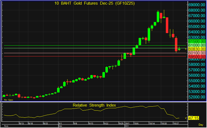 ราคา GF10Z25 ฟื้นตัวขึ้นจากแนวรับสำคัญ แต่ยังแนะนำรอเปิด Short จากแนวต้านที่ระดับ 61,000 บาท โดยมีเป้าทำกำไรที่ระดับ 60,100 บาท และตัดขาดทุนหากราคาทะลุแนวต้านที่ระดับ 61,500 บาทขึ้นไป