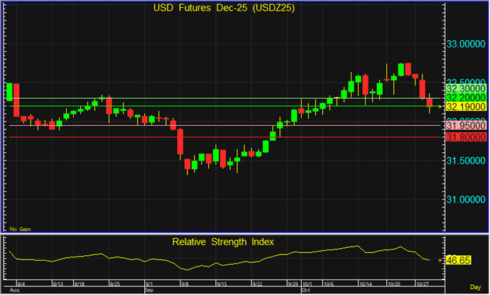 เช้านี้ราคา USDZ25 ยังคงมีแนวโน้มย่อตัวลง แต่ประเมินว่า Downside อาจเริ่มเหลือน้อยแล้ว จึงกลับมาแนะนำรอเปิด Long จากแนวรับที่ระดับ 31.95 บาท โดยมีเป้าหมายทำกำไรที่ระดับ 32.20 บาท และตัดขาดทุนหากราคาทะลุแนวรับที่ระดับ 31.80 บาทลงไป
