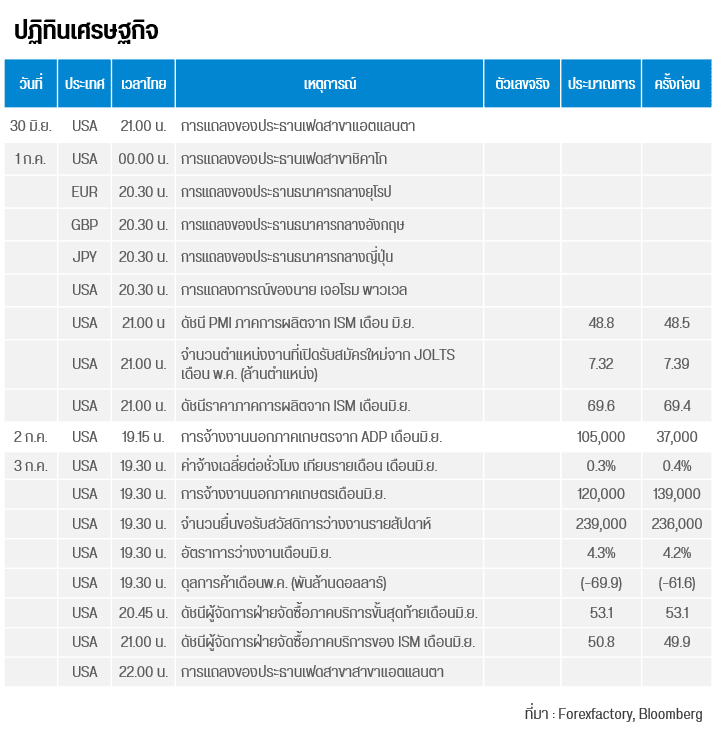 คืนนี้เวลา 20.30 น. ประธานธนาคารกลางสหรัฐฯ , ญี่ปุ่น , สหราชอาณาจักร , ยุโรป มีกำหนดกล่าวสุนทรพจน์ร่วมกันที่ประเทศโปรตุเกส และเวลา 21.00 น. สหรัฐฯ มีการเปิดเผย ดัชนี PMI ภาคการผลิตจาก ISM เดือน มิ.ย. และ จำนวนตำแหน่งงานที่เปิดรับสมัครใหม่จาก JOLTS เดือน พ.ค.
