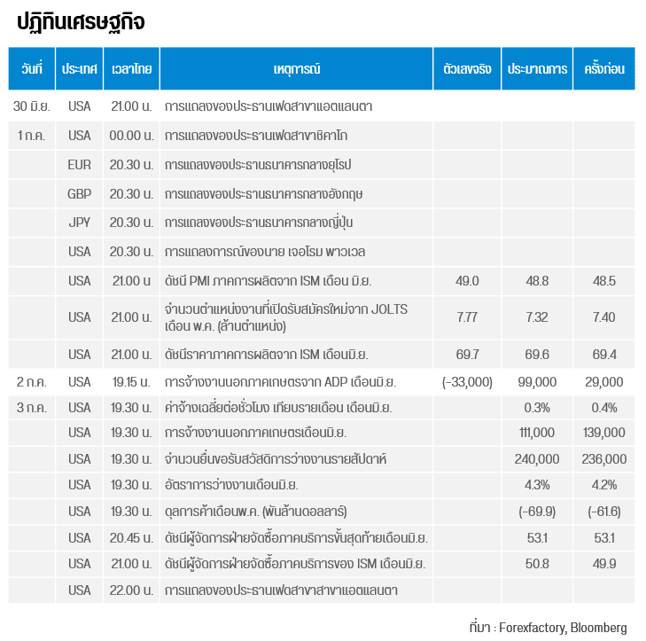 เดือนมิ.ย. , ค่าจ้างเฉลี่ยต่อชั่วโมงเทียบรายเดือน เดือนมิ.ย. และ จำนวนผู้ขอรับสวัสดิการว่างงานรายสัปดาห์ และเวลา 21.00 น. สหรัฐฯ มีการเปิดเผย ดัชนีผู้จัดการฝ่ายจัดซื้อภาคบริการของ ISM เดือนมิ.ย