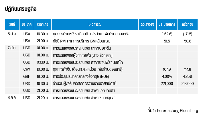 สืบเนื่องมาจากเมื่อวันศุกร์ที่ผ่านมา สหรัฐฯ เผยตัวเลข Non-Farm Payroll และอัตราการว่างงานที่บ่งชี้ถึงเศรษฐกิจสหรัฐฯ อ่อนแอกว่าคาด ส่งผลให้ตลาด CME FedWatch Tool พลิกกลับมาคาดการณ์ว่า เฟดจะลดดอกเบี้ย 0.25% จำนวน 3 ครั้งในเดือน ก.ย. , ต.ค. และ ธ.ค. ในปีนี้ จากเดิมที่ตลาดคาดการณ์เฟดจะลดดอกเบี้ย 0.25% เพียงเดือน ธ.ค. ในขณะที่ผู้ว่าการเฟด เอเดรียนา คูเกอร์ ประกาศลาออกก่อนครบวาระ ทำให้ปธน.โดนัลด์ ทรัมป์ มีโอกาสแต่งตั้งผู้ว่าเฟดคนใหม่ที่สนับสนุนให้เฟดลดดอกเบี้ย อย่างไรก็ตาม ธนาคารยักษ์ใหญ่สหรัฐฯ อย่าง Goldman Sachs รายงานว่า ภาษีศุลกากรจะเริ่มผลักดันให้เงินเฟ้อสหรัฐฯ พุ่งสูงขึ้นในอีก 8 เดือนข้างหน้า โดยสินค้านำเข้าหลักๆ ที่ส่งผลต่อเงินเฟ้อ อาทิเช่น คอมพิวเตอร์ อุปกรณ์อิเล็กทรอนิกส์ เสื้อผ้า รองเท้า และเฟอร์นิเจอร์ เป็นต้น ซึ่งสินค้านำเข้าเหล่านี้ อาจยังคงเป็นอุปสรรคสำคัญต่อการลดดอกเบี้ยของเฟดในปีนี้ที่ตลาดยังคงจับตาต่อไป ปิดท้ายด้วยข้อมูลที่น่าสนใจ ในวันเสาร์ที่ผ่านมารัฐบาลอินเดียยังคงเดินหน้าซื้อน้ำมันต่อเนื่องจากรัสเซียแม้ทรัมป์จะขู่ว่าจะมีมาตรการลงโทษอินเดีย แต่มาในภายหลังทรัมป์กลับแจ้งว่าไม่ได้ใส่ใจว่าอินเดียจะมีท่าทีอย่างไรต่อรัสเซีย ทางด้านกองทุนฯ SPDR