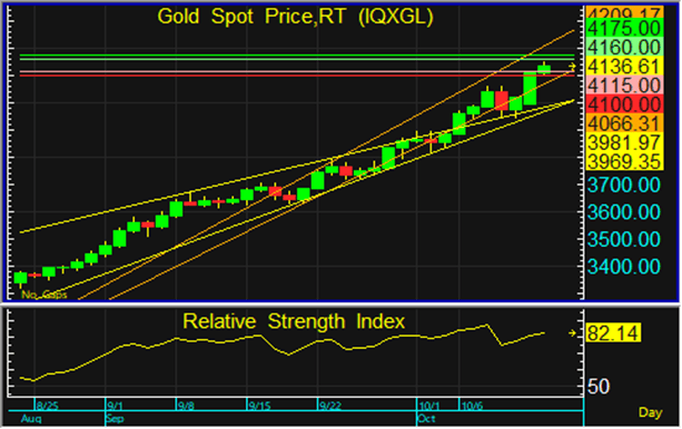 ทองโลกอยู่ในระยะขาขึ้นต่อเนื่อง แต่ในระยะสั้นมีแนวโน้มปรับตัวขึ้นสอบแนวต้านที่ 4,160 ดอลลาร์ และมีการปรับตัวลงในภายหลัง จึงประเมินว่า ทองโลกอาจย่อตัวลงทดสอบแนวรับที่ 4,115 ดอลลาร์ ก่อนกลับตัวเป็นขาขึ้นต่อ แต่หากทองโลกหลุดแนวรับถัดไปที่ 4,100 ดอลลาร์ ทองโลกอาจเข้าสู่การปรับฐานลงระยะสั้น