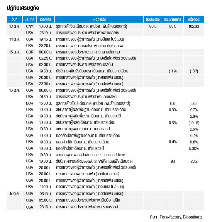 รีพับลิกันจะสามารถตกลงกันได้เกี่ยวกับการผ่านร่างงบประมาณชั่วคราว ในขณะที่นาย Michael Hartnett นักยุทธศาสตร์ของ Bank of America (BoFA) คาดการณ์ว่า ราคาทองคำจะแตะ 6,000 ดอลลาร์ ในปีหน้า เนื่องจากสัดส่วนการลงทุนในทองคำที่นักลงทุนหรือสถาบันต่าง ๆ ถือครองอยู่มีน้อยเกินไป เมื่อเทียบกับสินทรัพย์ประเภทอื่น ๆ ในพอร์ตโฟลิโอ และประธานเฟดคนใหม่ที่เอื้อนโยบายการเงินผ่อนคลายที่อาจก่อให้เกิดฟองสบู่ อย่างไรก็ตาม ดัชนีเงินดอลลาร์ (DXY) ได้ปรับตัวขึ้นอีกครั้ง สู่ระดับ 99.24 หน่วย จาก 98.94 หน่วย สืบเนื่องมาจากเงินเยนและยูโรอ่อนค่า และนายสก็อตต์ เบสเซนต์ รมว.คลังสหรัฐฯ เปิดเผยว่า มาตรการภาษี 100% ที่ปธน.ทรัมป์ประกาศจะเรียกเก็บจากจีนในวันจันทร์นั้น อาจไม่จำเป็นต้องเกิดขึ้น และเจ้าหน้าที่จีน-สหรัฐฯ จะมีการหารือกันที่กรุงวอชิงตันในสัปดาห์นี้ รวมถึงยังคงมีกำหนดการพบกับปธน.สี จิ้นผิง – ปธน.ทรัมป์ ที่ APEC ณ เกาหลีใต้ในวันที่ 31 ต.ค. -1 พ.ย. ทางด้านกองทุน SPDR ซื้อทองคำ 1.72 ตัน รวมสุทธิ 1,018.88 ตัน