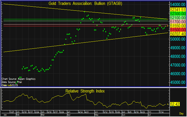 ราคาทองในประเทศอยู่ในระยะ Sideway Up จากการที่ทองโลกเป็นขาขึ้น แต่ค่าเงินบาทแข็งค่า จึงแนะนำรอเข้าซื้อสะสมแนวรับที่ระดับ 51,700 บาท และขายทำกำไรหากราคาทดสอบแนวต้านที่ 52,100 บาท แต่หากราคาหลุดแนวรับที่ 51,500 บาทลงไป แนะนำขายตัดขาดทุน