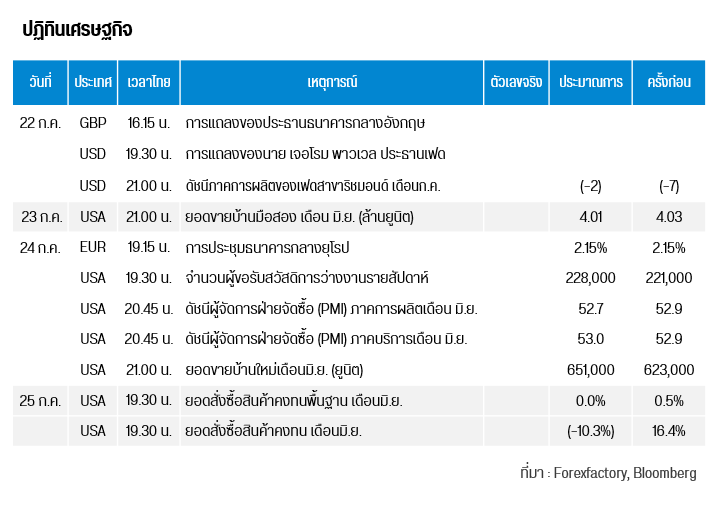 เย็นนี้เวลา 16.15 น. อังกฤษ มีการแถลงของประธานธนาคารกลางอังกฤษ , เวลา 19.30 น. สหรัฐฯ มีการแถลงของนาย เจอโรม พาวเวล ประธานเฟด และ เวลา 21.00 น. ประกาศตัวเลขดัชนีภาคการผลิตของเฟดสาขาริชมอนด์ เดือนก.ค.
