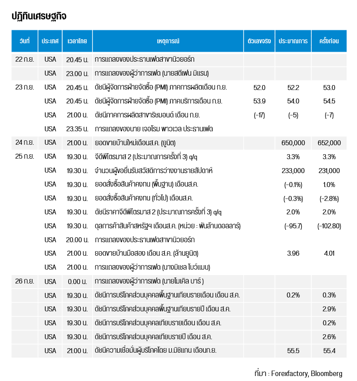 ทองโลกมีการปรับตัวขึ้น จากการที่ดัชนีเงินดอลลาร์ (DXY) ได้ปรับตัวลงสู่ระดับ 97.30 จากระดับสูงสุดที่ 97.64 อีกทั้งบอนด์ยีลด์สหรัฐฯ อายุ 10 ปี ได้ปรับตัวลงสู่ระดับ 4.10% หลังจากปรับตัวขึ้น 4 วันติดต่อกัน โดยทำสดสูงสุดที่ 4.14% ส่งผลให้ตลาดให้ความสนใจในบอนด์ยีลด์สหรัฐฯ น้อยลง ในฐานะสินทรัพย์ปลอดภัยที่ให้ดอกเบี้ยต่ำ จากข้อมูลข้างต้น สืบเนื่องมาจาก สหรัฐฯ เผยดัชนีผู้จัดการฝ่ายจัดซื้อ (PMI) ภาคการผลิต / บริการ หดตัวลงมากกว่าครั้งก่อน ในขณะที่นายเจอโรม พาวเวล ประธานเฟด ได้กล่าวสุนทรพจน์ต่อผู้นำภาคธุรกิจเมื่อวันจันทร์ โดยยังคงเน้นย้ำจุดยืนเดียวกันกับการประชุม FOMC เมื่อวันที่ 17 ก.ย. ในการกลับมาใช้นโยบายการเงินแบบผ่อนคลายเพื่อพยุงตลาดแรงงานที่อ่อนแอทั้งในด้านอุปสงค์-อุปทาน และมีมุมมองว่าเงินเฟ้อที่ตรงตัวสูงนั้นเป็นเพียงแค่เรื่องชั่วคราว อย่างไรก็ตาม พาวเวลก็ได้ย้ำถึงการจัดการความเสี่ยงด้านเงินเฟ้อที่สูงและยืดเยื้ออย่างรอบคอบ เพื่อให้มั่นใจว่าจะไม่เป็นปัญหาต่อเศรษฐกิจในระยะยาว ทางด้านกองทุน SPDR ถือครองทองคำเท่าเดิม รวมสุทธิ 1,000.57 ตัน