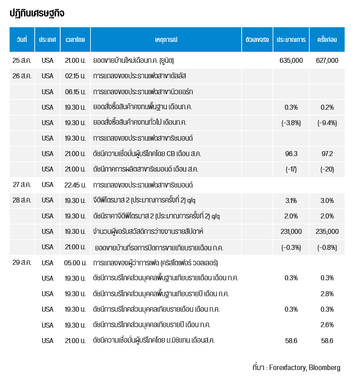 ทองโลกปรับตัวขึ้น จากการที่ดัชนีดอลลาร์ (DXY) อ่อนค่าลงสู่ระดับ 97.7 หน่วย จากระดับสูงสุดที่ 98.6 หน่วยในวันเดียวกัน อีกทั้งบอนด์ยีลด์สหรัฐฯ อายุ 10 ปีได้ปรับตัวลงสู่ระดับ 4.25% จากจุดสูงสุดที่ 4.32% สืบเนื่องมาจากงาน Jackson Hole เมื่อคืนวันศุกร์ที่ผ่านมา นายเจอโรม พาวเวล ประธานเฟด ได้เลือกที่จะเปิดช่องทางลดดอกเบี้ยในเดือนก.ย.นี้จากอัตราการว่างงานที่มีแนวโน้มสูงขึ้นและเศรษฐกิจสหรัฐฯ ชะลอตัว อีกทั้งในด้านของภาษีนำเข้าสหรัฐฯ อันมีผลต่อเงินเฟ้อที่สูงขึ้นนั้น เป็นสิ่งที่เฟดประเมินว่าเริ่มเห็นผลลัพธ์ที่ชัดเจนแล้ว จากปัจจัยข้างต้น ส่งผลให้ตลาด CME Fed Watch ได้ออกมาคาดการณ์ถึง 87% จาก 70% ว่า เฟดมีแนวโน้มลดดอกเบี้ย 0.25% ในเดือนก.ย. และมีโอกาส 48% ที่จะลดดอกเบี้ย 0.25% ในเดือนธ.ค. อย่างไรก็ตาม พาวเวลได้กล่าวถึงการเปลี่ยนแปลงกรอบนโยบายของเฟดใหม่ โดยต่อจากนี้ไป เฟดอาจยกเลิกมาตรการเงินเฟ้อเฉลี่ยหรือ AIT (Average Inflation Targeting) และผลักดันนโยบายเชิงรุก ด้วยการตอบสนองต่อเงินเฟ้อทันทีหากเงินเฟ้อยังไม่ลงสู่ 2% แทนการรอค่าเฉลี่ยเงินเฟ้อก่อนแล้วค่อยตัดสินใจปรับขึ้น / ลดดอกเบี้ย ซึ่งอาจทำให้ในอนาคต ทองโลกอาจมีความผันผวนสูงขึ้น ทางด้านกองทุน SPDR ถือครองทองคำเท่าเดิม รวมสุทธิ 956.77 ตัน