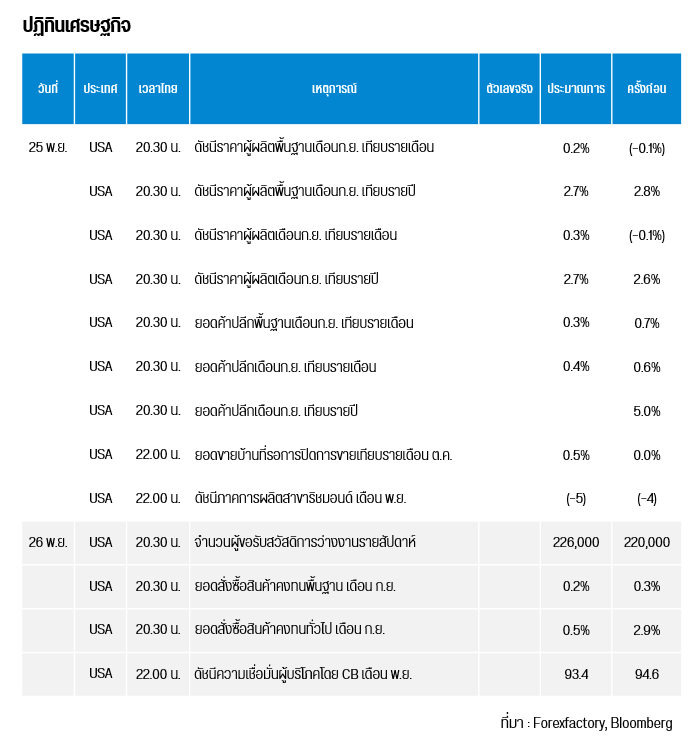 คืนนี้เวลา 20.30 น. สหรัฐฯ เผยดัชนีราคาผู้ผลิตพื้นฐาน / ทั่วไปเดือนก.ย. เทียบรายเดือน / รายปี , ยอดค้าปลีกพื้นฐาน / ทั่วไป เดือนก.ย. และเวลา 22.00 น. ยอดขายบ้านที่รอการปิดการขายเทียบรายเดือน ต.ค. และดัชนีภาคการผลิตสาขาริชมอนด์ เดือน พ.ย.