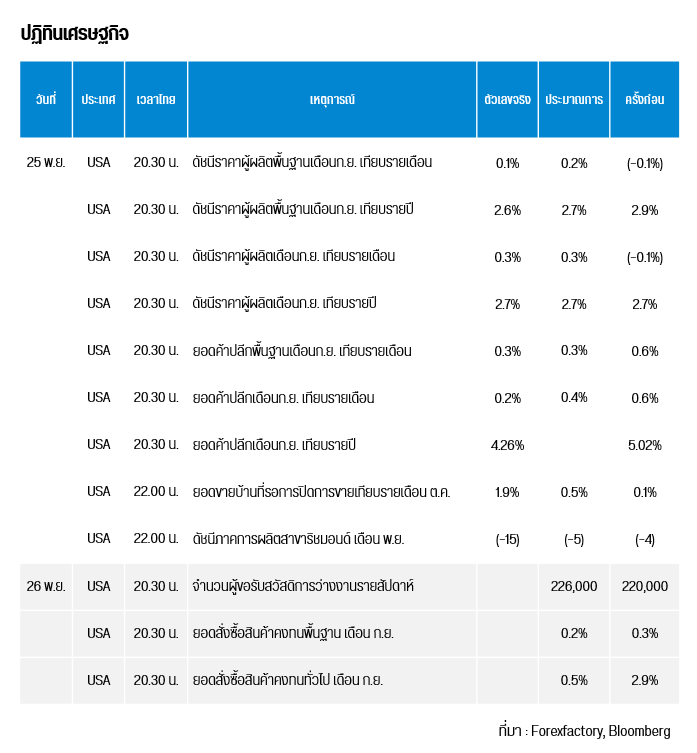 ทองโลกยังคงมีการทรงตัวขึ้น จากการที่ดัชนีเงินดอลลาร์ (DXY) ได้ปรับตัวลงในวันเดียวกัน สู่ระดับ 99.79 หน่วย จาก 100.21 หน่วย อีกทั้งบอนด์ยีลด์สหรัฐฯ อายุ 10 ปี ได้มีการปรับตัวลงเป็นวันที่ 4 สู่ระดับ 4.00% จาก 4.14% สืบเนื่องมาจากตลาด CME FedWatch ได้คาดการณ์ถึง 84.3% จาก 71.1% ว่าเฟดอาจลดดอกเบี้ย 0.25% ในเดือนธ.ค.นี้ ในขณะที่สหรัฐฯ เผยตัวเลขยอดค้าปลีกเดือนก.ย. น้อยกว่าครั้งก่อน นอกจากนี้ นายคริสโตเฟอร์ วอลเลอร์ ผู้ว่าการเฟดสายปธน.ทรัมป์ ได้กล่าวว่ามีการสัมภาษณ์รอบ 2 กับนายสก็อตต์ เบสเซนต์ รมว.คลังสหรัฐ ซึ่งดูแลกระบวนการสรรหาประธานเฟดคนใหม่แทนนายเจอโรม พาวเวล ซึ่งจะหมดวาระประธานเฟดในเดือนพ.ค. 2026 และได้รับการตอบรับที่ดี ซึ่งเบสเซนต์หวังว่าจะสามารถเสนอรายชื่อให้ปธน.ทรัมป์หลังวันที่ 27 พ.ย. อย่างไรก็ตาม สหรัฐฯ ได้เผยดัชนี PPI ขยายตัวมากกว่าครั้งก่อน ในขณะที่ตลาดยังคงจับตาความขัดแย้งระหว่างจีน – สหรัฐฯ ในด้านประเด็นความขัดแย้งในไต้หวันและญี่ปุ่น ทางด้านกองทุน SPDR ถือครองทองคำเท่าเดิม รวมสุทธิ 1,040.86 ตัน