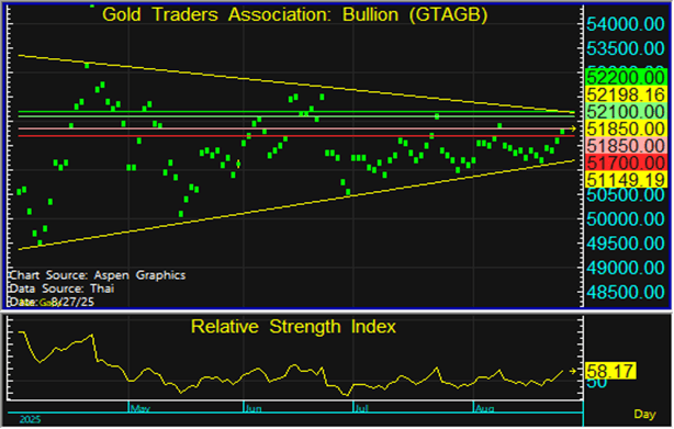ราคาทองในประเทศอยู่มนระยะ Sideway Up จากการที่ทองโลกปรับตัวขึ้น ในขณะที่ค่าเงินบาทแข็งค่า จึงแนะนำเข้าซื้อสะสมตามแนวรับที่ระดับ 51,850 บาท และขายทำกำไรหากราคาทดสอบแนวต้านที่ 52,100 บาท แต่หากราคาหลุดแนวรับที่ 51,700 บาท ลงไป แนะนำขายตัดขาดทุน