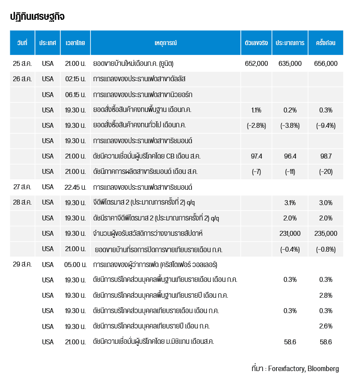 ทองโลกทยอยปรับตัวขึ้น จากการที่ปธน. โดนัลด์ทรัมป์ ได้ขู่ว่าจะจำกัดการส่งออกเทคโนโลยีขั้นสูงและเซมิคอนดักเตอร์ของสหรัฐฯ ไปยังสหภาพยุโรป (EU) รวมถึงอาจพิจารณาขึ้นภาษีนำเข้าเพิ่มเติม เนื่องจากทรัมป์แสดงความไม่พอใจในกฎระเบียบต่อต้านการผูกขาดทางเทตโนโลยีของ EU มาอย่างยาวนานกับบริษัทเทคโนโลยียักษ์ใหญ่ของสหรัฐฯ อาทิเช่น บริษัท Google ของ Alphabet Inc. , Apple Inc. และ Meta Inc. ในขณะที่ ฝ่ายบริหารสหรัฐฯ ได้ลงนามยกเลิกนโยบายปลอดภาษี 0% สำหรับสินค้าที่มีมูลค่าต่ำกว่า 800 ดอลลาร์ในวันศุกร์นี้ ซึ่งเร็วกว่าเส้นตายที่กำหนดไว้ในร่างกฎหมายลดภาษีที่ได้รับการอนุมัติจากรัฐสภาถึง 2 ปี อย่างไรก็ตาม นางลิซ่า คุก ผู้ว่าการเฟด ได้ปฏิเสธที่จะลาออก และได้โต้แย้งคำสั่งปลดออกของ ปธน.ทรัมป์หลังจากถูกกล่าวหาว่า คุกได้ทุจริตในการซื้ออสังหาริมทรัพย์ โดยคุกสามารถยื่นคำร้องขอคำสั่งคุ้มครองต่อศาล เพื่อขอให้สามารถกลับเข้าทำงานตามปกติได้ทันทีในระหว่างที่กระบวนการพิจารณาคดียังดำเนินต่อไป ทางด้านกองทุน SPDR ซื้อทองคำ 1.49 ตันรวมสุทธิ 959.92 ตัน
