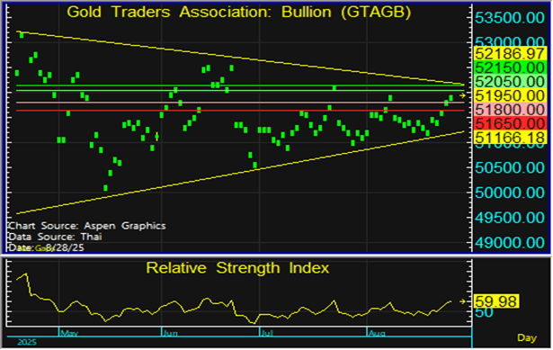 ราคาทองในประเทศอยู่ในระยะ Sideway Up จากการที่ทองโลกเป็นขาขึ้น ในขณะที่ค่าเงินบาทแข็งค่า จึงแนะนำเข้าซื้อสะสมแนวรับที่ระดับ 51,800 บาท และขายทำกำไรหากราคาทดสอบแนวต้านที่ 52,050 บาท แต่หากราคาหลุดแนวรับที่ 51,650 บาท ลงไป แนะนำขายตัดขาดทุน