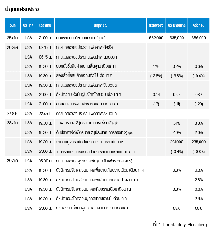 คืนนี้เวลา 19.30น. สหรัฐฯ เผยจีดีพีไตรมาส 2 (ประมาณการครั้งที่ 2) q/q , ดัชนีราคาจีดีพีไตรมาส 2 (ประมาณการครั้งที่ 2) q/q , จำนวนผู้ขอรับสวัสดิการว่างงานรายสัปดาห์ และเวลา 21.00 น. ยอดขายบ้านที่รอการปิดการขายเทียบรายเดือน ก.ค.