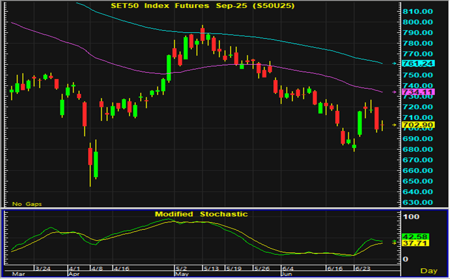 ดัชนีตลาดหุ้นไทยวานนี้แกว่งตัวในกรอบแคบก่อนที่จะปิดตลาดเพิ่มขึ้นจากระดับปิดวันศุกร์เล็กน้อย นักลงทุนต่างใช้ความระมัดระวังในการลงทุนเพื่อติดตามประเด็นการเมืองในประเทศทั้งการปรับคณะรัฐมนตรี และเสถียรภาพของรัฐบาล รวมทั้งการพิจารณาของศาลรัฐธรรมนูญซึ่งในวันนี้จะมีการพิจารณาว่าจะรับคดีที่มีผู้ยื่นฟ้องให้นายกรัฐมนตรียุติการปฏิบัติหน้าที่หรือไม่ และหากรับคำร้องไว้จะมีคำสั่งใดๆที่อาจส่งผลต่อการปฏิบัติหน้าที่ของนายกรัฐมนตรี ดังนั้นการเคลื่อนไหวของตลาดหุ้นไทยในวันนี้จึงมีแนวโน้มแกว่งตัวแคบเพื่อรอติดตามประเด็นดังกล่าว ส่วนประเด็นต่างประเทศทั้งการรายงานข้อมูลเศรษฐกิจของสหรัฐ รวมทั้งประเด็นภาษีการค้าเป็นประเด็นที่ต้องติดตาม การเก็งกำไรในสัญญาเดือน U แนะนำเปิดสถานะซื้อใกล้แนวรับบริเวณ 693-694 จุด และมีจุดขายตัดขาดทุนอยู่ที่ 690 จุด โดยมีแนวต้านสำหรับเก็งกำไรฝั่งขายในระหว่างวันอยู่ที่บริเวณ 709-710 จุด และมีจุดปิดสถานะตัดขาดทุนอยู่ที่ 712 จุด