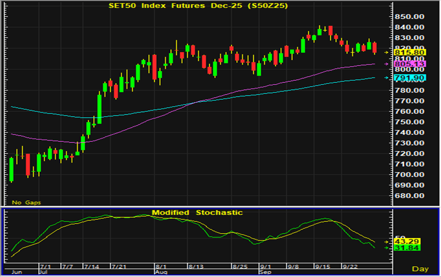 ดัชนีตลาดหุ้นไทยวานนี้ปิดตลาดปรับตัวลงในปริมาณค่อนข้างมาก ในระหว่างวันดัชนีเคลื่อนไหวในแดนบวกได้ในช่วงสั้นๆ แต่แรงขายที่มีออกมามากกดดันดัชนีปิดตลาดปรับตัวลง ราคาหุ้นในหลายกลุ่มซึ่งปรับตัวขึ้นมามากจึงเริ่มมีการปรับฐานเกิดขึ้น ประเด็นต่างประเทศจากปัญหาทางการคลังของสหรัฐเป็นอีกปัจจัยหนึ่งที่กดดันการลงทุน และส่งผลต่อความน่าเชื่อถือของเงินดอลลาร์และสินทรัพย์เสี่ยง นักลงทุนต่างรอติดตามรายงานข้อมูลตลาดแรงงานของสหรัฐช่วงปลายสัปดาห์ที่อาจมีผลต่อการประเมินทิศทางดอกเบี้ย ส่วนประเด็นในประเทศจากมาตรการกระตุ้นเศรษฐกิจของรัฐบาล เป็นปัจจัยบวกต่อหุ้นกลุ่มบริโภคในประเทศ การเก็งกำไรในสัญญาเดือน Z ซึ่งในระยะสั้นอาจปรับตัวลงต่อเนื่องจากวันอังคาร การเก็งกำไรฝั่งซื้อควรรอเปิดสถานะใกล้แนวรับบริเวณ 807-808 จุด และมีจุดขายตัดขาดทุนอยู่ที่ 805 จุด โดยมีแนวต้านสำหรับเก็งกำไรฝั่งขายอยู่ที่ 822-823 จุด และมีจุดปิดสถานะตัดขาดทุนอยู่ที่ 825 จุด