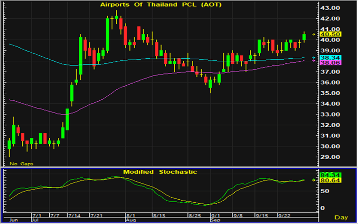 ราคาหุ้น AOT ปิดตลาดที่จุดสูงสุดในรอบหลายสัปดาห์ การเคลื่อนไหวทางเทคนิคจึงยังมีแนวโน้มฟื้นตัว และสามารถเปิดสถานะซื้อใกล้แนวรับบริเวณ 39.75-40 บาท โดยมีจุดขายตัดขาดทุนอยู่ที่ 39 บาท