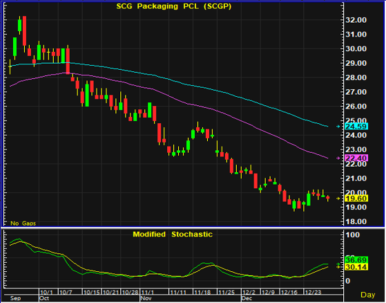 ราคาหุ้น SCGP ปรับตัวลงต่อเนื่องในการซื้อขายสัปดาห์ก่อน แต่เครื่องมือทางเทคนิคยังมีสัญญาณฟื้นตัว การเก็งกำไรระยะสั้นแนะนำเปิดสถานะซื้อบริเวณ 19.2-19.3 บาท และมีจุดขายตัดขาดทุนอยู่ที่ 19 บาท