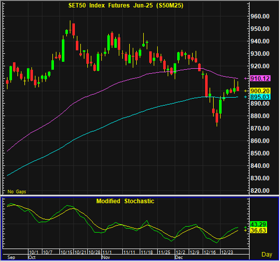 ตลาดหุ้นไทยปีที่ผ่านมาปิดตลาดลดลงต่อเนื่องเป็นปีที่ 2 โดยดัชนีปรับตัวลงจากปีก่อนหน้าราวร้อยละ 2 ทิศทางดอกเบี้ยขาลงเป็นปัจจัยบวกต่อการลงทุน แต่ความกังวลเรื่องการกีดกันการค้าที่อาจรุนแรงขึ้นในปีนี้กลับมาเป็นปัจจัยกดดันการลงทุน ส่วนปีนี้ทิศทางดอกเบี้ยรวมทั้งนโยบายต่างประเทศของสหรัฐต่อประเทศต่างๆเป็นประเด็นหลักที่อยู่ในความสนใจของนักลงทุน ขณะที่การเมืองในประเทศเป็นอีกหนึ่งปัจจัยที่ต้องติดตาม ส่วนในระยะสั้นด้วยราคาหุ้นในตลาดหุ้นไทยที่ปรับลงมามาก และคาดว่าจะมีแรงซื้อเก็งกำไรหุ้นที่ได้ประโยชน์จากมาตรการกระตุ้นเศรษฐกิจของรัฐบาลเป็นปัจจัยบวกต่อการลงทุน การเก็งกำไรในสัญญาเดือน H หากในระหว่างวันอ่อนตัวลงเข้าใกล้แนวรับ 898-900 จุด แนะนำเปิดสถานะซื้อ โดยมีจุดขายตัดขาดทุนอยู่ที่ 895 จุด และมีแนวต้านสำหรับเปิดสถานะขายอยู่ที่บริเวณ 912-913 จุด โดยมีจุดปิดสถานะตัดขาดทุนอยู่ที่ 915 จุด