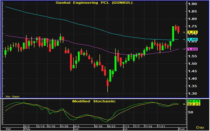 ราคาหุ้น GUNKUL อ่อนตัวลงในการซื้อขายช่วงปลายสัปดาห์ แต่ยังไม่กลับลงไปต่ำกว่าแนวรับบริเวณ 1.67-1.68 บาท หากในระหว่างวันสามารถประคองตัวเหนือแนวรับนี้ แนะนำเปิดสถานะซื้อเก็งกำไร และมีจุดขายตัดขาดทุนอยู่ที่ 1.65 บาท