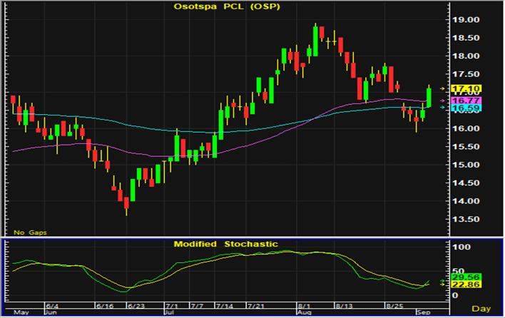 ราคาหุ้น OSP ปรับตัวเพิ่มขึ้นในปริมาณมากในการซื้อขายวานนี้ และกลับมาเคลื่อนไหวในทิศทางฟื้นตัว หากในระหว่างวันสามารถเคลื่อนไหวเหนือแนวรับบริเวณ 16.7-16.8 บาท แนะนำเปิดสถานะซื้อ และมีจุดขายตัดขาดทุนอยู่ที่ 16.5 บาท