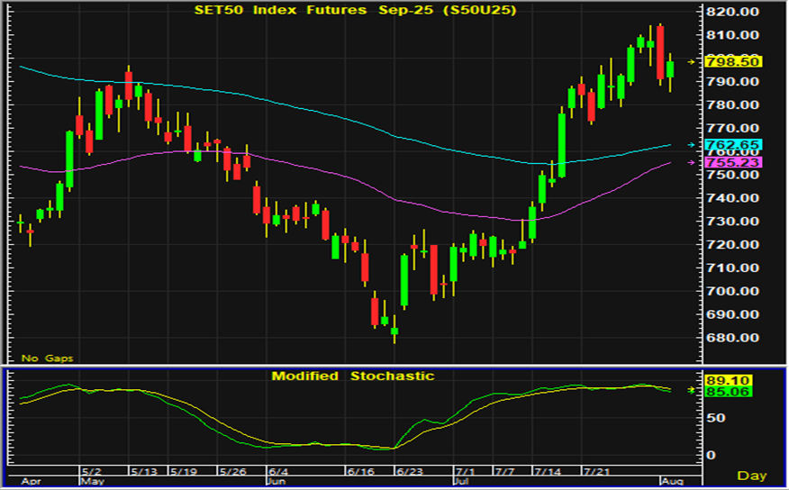 ดัชนีตลาดหุ้นไทยปิดตลาดเพิ่มขึ้นจากวันศุกร์ ในระหว่างวันดัชนีอ่อนตัวลงไปเคลื่อนไหวในแดนลบก่อนที่จะเริ่มมีแรงซื้อกลับเข้ามาจนทำให้ดัชนีฟื้นตัว รายงานข้อมูลตลาดแรงงานของสหรัฐที่ออกมาต่ำกว่าคาด สร้างความกังวลเรื่องการชะลอตัวของเศรษฐกิจ และอาจทำให้ธนาคารกลางสหรัฐลดดอกเบี้ยลงเร็วกว่าที่เคยประเมิน เงินทุนบางส่วนจึงไหลออกจากสหรัฐและเป็นปัจจัยบวกต่อการเคลื่อนไหวของตลาดหุ้นไทย การเจรจาการค้าระหว่างสหรัฐและหลายประเทศที่แม้จะมีข้อตกลงในการลดภาษี แต่ผลกระทบจากการเก็บภาษีที่กระทบต่อเศรษฐกิจโลกยังเป็นประเด็นที่ต้องติดตาม ส่วนประเด็นในประเทศเกี่ยวกับสถานการณ์การเมือง รวมทั้งการคาดการณ์ผลประกอบการของบริษัทจดทะเบียน เป็นประเด็นที่นักลงทุนให้ความสนใจ เก็งกำไรในสัญญาเดือน U แนะนำรอเปิดสถานะซื้อใกล้แนวรับ 782-783 จุด และมีจุดขายตัดขาดทุนอยู่ที่ 780 จุด โดยมีแนวต้านสำหรับเก็งกำไรฝั่งขายอยู่ที่ 805-806 จุด และมีจุดปิดสถานะตัดขาดทุนอยู่ที่ 810 จุด