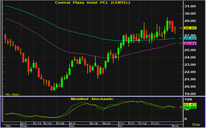 ราคาหุ้น CENTEL แกว่งตัวแคบและเคลื่อนไหวเหนือแนวรับสำคัญทางเทคนิคบริเวณ 27-27.25 บาท หากในระหว่างวันเคลื่อนไหวเหนือแนวรับนี้ แนะนำเปิดสถานะซื้อ และมีจุดขายตัดขาดทุนอยู่ที่ 26.75 บาท
