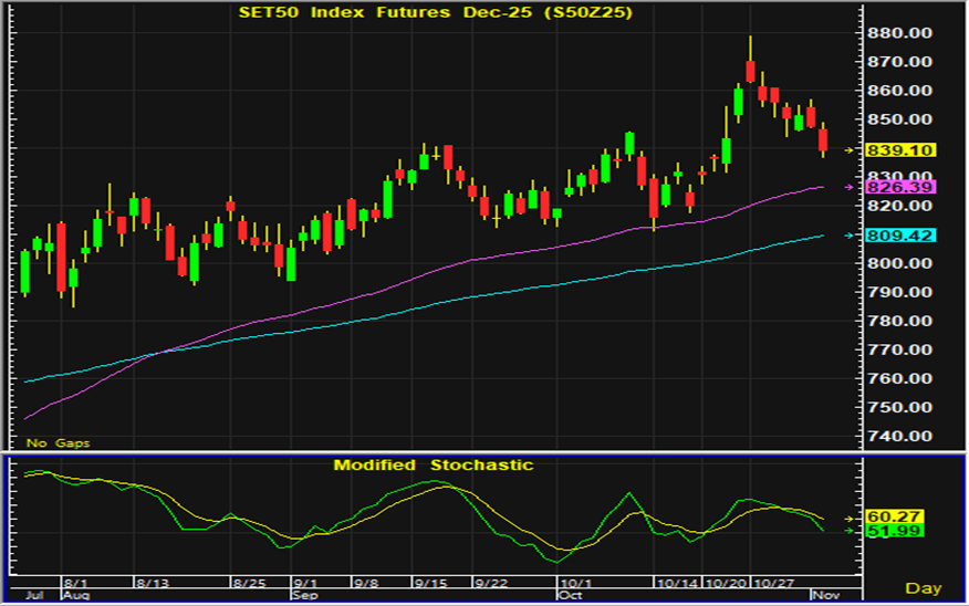 ดัชนีตลาดหุ้นไทยวานนี้แกว่งตัวผันผวน ดัชนีดีดตัวขึ้นไปแกว่งตัวในแดนบวกในระหว่างวัน ก่อนที่จะมีแรงขายกลับออกมากดดันดัชนีปิดตลาดปรับตัวลง แรงขายหุ้นปิโตรเคมีมีกลับออกมามาก หลังเศรษฐกิจโลกมีความไม่แน่นอนและอาจส่งผลให้ปริมาณความต้องการใช้ลดลง ขณะที่การรายงานผลประกอบการไตรมาส 3 ของบริษัทจดทะเบียนยังเป็นประเด็นที่นักลงทุนให้ความสนใจ โดยหุ้นกลุ่มสื่อสารซึ่งมีแนวโน้มที่จะมีผลประกอบการดีขึ้น รวมทั้งหุ้นกลุ่มที่ได้ประโยชน์จากการกระตุ้นเศรษฐกิจและการแก้ไขปัญหาหนี้ของภาครัฐ เป็นกลุ่มที่คาดว่าจะมีแรงซื้อเก็งกำไรกลับเข้ามา ส่วนการเคลื่อนไหวทางเทคนิคของตลาดหุ้นไทยระยะนี้มีสัญญาณเตือนการปรับฐาน การเก็งกำไรในสัญญาเดือน Z แนะนำรอเปิดสถานะซื้อใกล้แนวรับบริเวณ 832-833 จุด และมีจุดขายตัดขาดทุนอยู่ที่ 830 จุด โดยมีแนวต้านสำหรับเก็งกำไรฝั่งขายอยู่ที่ 847-848 จุด และมีจุดปิดสถานะตัดขาดทุนอยู่ที่ 850 จุด