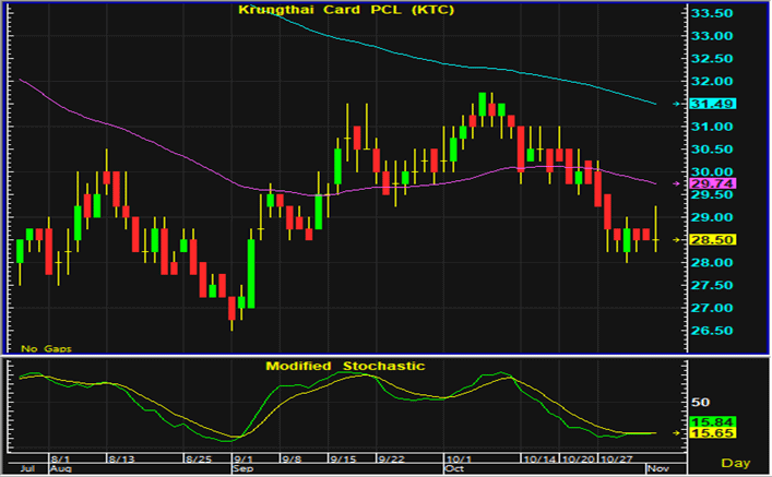 ราคาหุ้น KTC ปิดตลาดทรงตัวที่ระดับปิดของวันจันทร์ แต่ยังมีสัญญาณการดีดตัวทางเทคนิค การเก็งกำไรระยะสั้นแนะนำเปิดสถานะซื้อใกล้แนวรับบริเวณ 27.75-28 บาท และมีจุดขายตัดขาดทุนอยู่ที่ 27 บาท