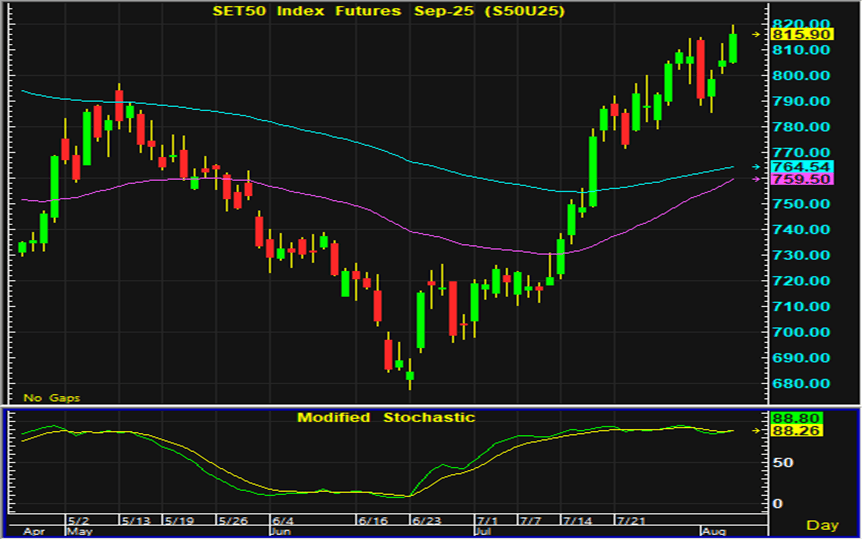 ดัชนีตลาดหุ้นไทยวานปิดตลาดเพิ่มขึ้นในปริมาณมาก ข้อมูลเศรษฐกิจของสหรัฐที่เริ่มมีสัญญาณชะลอตัว จนมีความคาดหวังว่าธนาคารกลางสหรัฐจะปรับลดดอกเบี้ยเร็วกว่าที่เคยประเมิน ส่งให้เงินทุนบางส่วนไหลออกจากสหรัฐ และด้วยดัชนีตลาดหุ้นไทยซึ่งปรับลงมามากกว่าตลาดหุ้นของหลายประเทศในระยะนี้ตลาดหุ้นไทยจึงเป็นตลาดที่ได้รับความสนใจจากนักลงทุน ส่วนประเด็นการค้าระหว่างสหรัฐและประเทศต่างๆแม้จะเริ่มมีความชัดเจน แต่ยังต้องติดตามว่าสหรัฐและจีนจะตกลงใช้ภาษีในระดับใด ขณะที่การรายงานผลประกอบการไตรมาส 2 ของบริษัทจดทะเบียน เป็นอีกหนึ่งประเด็นที่นักลงทุนให้ความสนใจ ส่วนการเคลื่อนไหวทางเทคนิคของสัญญาเดือน U กลับมาเคลื่อนไหวในทิศทางฟื้นตัว แต่ในระยะสั้นอาจมีการปรับฐานเกิดขึ้น จึงแนะนำรอเปิดสถานะซื้อใกล้แนวรับบริเวณ 811-812 จุด และมีจุดขายตัดขาดทุนอยู่ที่ 808 จุด โดยมีแนวต้านสำหรับเก็งกำไรฝั่งขายอยู่ที่ 821-822 จุด และมีจุดปิดสถานะตัดขาดทุนอยู่ที่ 825 จุด