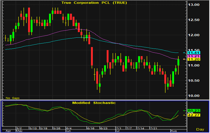 ราคาหุ้น TRUE มีสัญญาณซื้อทางเทคนิคเกิดขึ้นในช่วงต้นสัปดาห์ และยังมีแนวโน้มที่จะปรับตัวขึ้นต่อ โดยมีแนวรับบริเวณ 10.9-11 บาท เป็นแนวรับสำหรับเปิดสถานะซื้อ และมีจุดขายตัดขาดทุนอยู่ที่ 10.5 บาท
