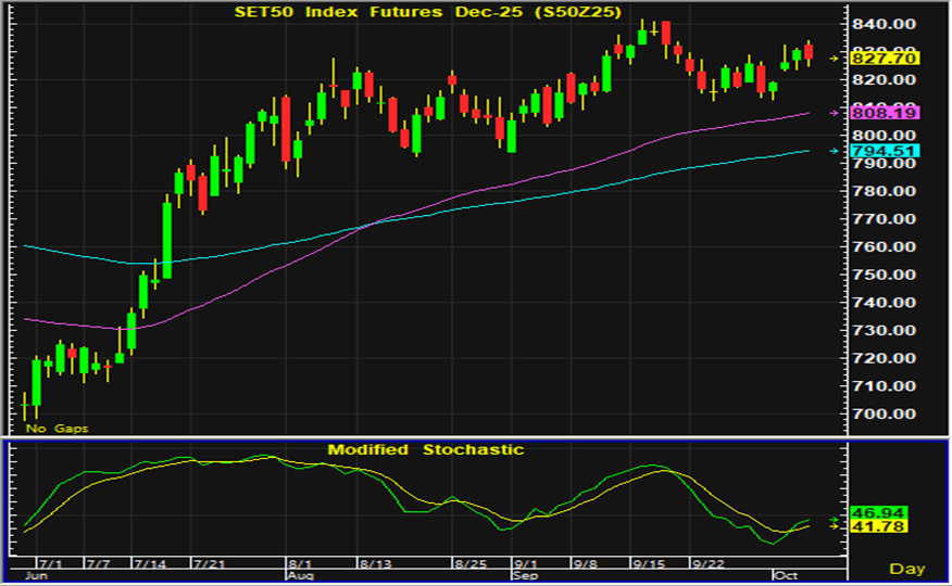 ดัชนีตลาดหุ้นไทยปรับตัวเพิ่มขึ้นช่วงเปิดตลาด แต่แรงขายที่มีออกมาในระหว่างวัน กดดันดัชนีปิดตลาดปรับตัวลง ปัจจัยต่างๆโดยรวมยั้งไม่มีปัจจัยใหม่ การเคลื่อนไหวของตลาดหุ้นไทยในระยะนี้จึงกลับมาแกว่งตัวแคบเพื่อรอติดตามประเด็นต่างๆ ทั้งการกระตุ้นเศรษฐกิจจากรัฐบาล ซึ่งคาดว่าในสัปดาห์นี้จะมีความชัดเจนเรื่องการกระตุ้นการบริโภคในประเทศ รวมทั้งทิศทางการดำเนินนโยบายการเงิน ซึ่งวันพุธนี้จะมีการประชุมของคณะกรรมการนโยบายการเงินของไทย ซึ่งคาดว่าจะมีการลดดอกเบี้ยลงร้อยละ 0.25 หุ้นกลุ่มบริโภคในประเทศ และกลุ่มที่ได้ประโยชน์จากการลดดอกเบี้ย จึงเป็นกลุ่มที่คาดว่าจะมีแรงซื้อกลับเข้ามา ขณะที่ปัจจัยต่างประเทศผลกระทบจากการปิดหน่วยงานรัฐบาลสหรัฐเป็นประเด็นที่ยังต้องติดตาม การเก็งกำไรในสัญญาเดือน Z มีแนวรับสำหรับเปิดสถานะซื้อในระหว่างวันอยู่ที่บริเวณ 821-822 จุด และมีจุดขายตัดขาดทุนอยู่ที่ 818 จุด โดยมีแนวต้านสำหรับเก็งกำไรฝั่งขายอยู่ที่ 834-835 จุด และมีจุดปิดสถานะตัดขาดทุนอยู่ที่ 838 จุด
