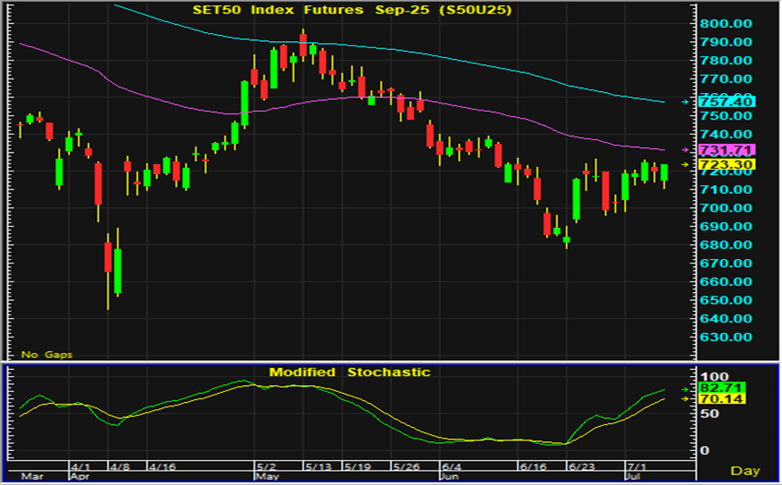 ดัชนีตลาดหุ้นไทยอ่อนตัวลงช่วงเปิดตลาดก่อนที่จะเริ่มฟื้นตัวขึ้นในระหว่างวัน และสามารถกลับขึ้นมาปิดตลาดในแดนบวก ปัญหารการค้าระหว่างสหรัฐและประเทศต่างๆ เป็นประเด็นกดดันการลงทุน หุ้นกลุ่มที่คาดว่าจะเสียประโยชน์จากการเจรจาการค้าของไทยและสหรัฐมีแรงขายกลับออกมา แต่ด้วยราคาหุ้นที่ปรับลงมามาก และมีความคาดหวังว่าดอกเบี้ยของไทยอาจปรับตัวลง เป็นปัจจัยบวกที่ทำให้มีแรงซื้อกลับเข้ามา ส่วนในวันนี้ประเด็นการค้าระหว่างสหรัฐและประเทศต่างๆ ซึ่งจะมีการเจรจาเพื่อหาข้อตกลงในการลดภาษีลง เป็นประเด็นที่ต้องติดตาม การเคลื่อนไหวของตลาดหุ้นไทยจึงมีแนวโน้มแกว่งตัวแคบเพื่อรอติดตามความชัดเจน ด้วยราคาหุ้นที่ปรับลงมามาก หากในระหว่างวันดัชนีอ่อนตัวลง คาดว่าจะมีแรงซื้อเก็งกำไรกลับเข้ามา การเก็งกำไรในสัญญาเดือน U แนะนำเปิดสถานะซื้อใกล้แนวรับ 711-712 จุด และมีจุดขายตัดขาดทุนอยู่ที่ 708 จุด โดยมีแนวต้านสำหรับเก็งกำไรฝั่งขายอยู่ที่บริเวณ 726-727 จุด และมีจุดปิดสถานะตัดขาดทุนอยู่ที่ 730 จุด
