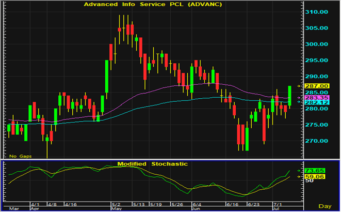ราคาหุ้น ADVANC ดีดตัวขึ้นในปริมาณมาก และปิดตลาดที่จุดสูงสุดของวัน การเคลื่อนไหวทางเทคนิคจึงมีแนวโน้มฟื้นตัว และสามารถเปิดสถานะซื้อบริเวณ 284-285 บาท โดยมีจุดขายตัดขาดทุนอยู่ที่ 282 บาท