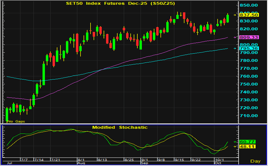 ดัชนีตลาดหุ้นไทยวานนี้มีแรงซื้อมีเข้ามาตั้งแต่เปิดตลาดภาคเช้า และในการซื้อขายระหว่างวันแรงซื้อหุ้นขนาดใหญ่ที่มีเข้ามาอย่างต่อเนื่อง จนทำให้ดัชนีปิดตลาดเพิ่มขึ้นในปริมาณมาก ความชัดเจนเรื่องการกระตุ้นเศรษฐกิจของรัฐบาล เป็นปัจจัยบวกต่อการเคลื่อนไหวของตลาดหุ้นไทย ส่วนในวันนี้การเคลื่อนไหวของตลาดหุ้นไทยยังมีแนวโน้มฟื้นตัว โดยมีการประชุมของคณะกรรมการนโยบายการเงินของไทยเป็นประเด็นที่นักลงทุนรอติดตาม ด้วยเศรษฐกิจไทยที่มีแนวโน้มชะลอตัว คาดว่าการประชุมครั้งนี้จะมีมติลดอัตราดอกเบี้ยลงร้อยละ 0.25 ซึ่งจะเป็นปัจจัยบวกต่อหุ้นกลุ่มอสังหาริมทรัพย์ รวมทั้งกลุ่มที่ได้ประโยชน์จากดอกเบี้ยขาลง ขณะที่ปัญหาทางการคลังของสหรัฐยังเป็นปัจจัยลบกดดันการลงทุน การเก็งกำไรในสัญญาเดือน Z มีแนวรับสำหรับเปิดสถานะซื้อในระหว่างวันอยู่ที่บริเวณ  831-832 จุด และมีจุดขายตัดขาดทุนอยู่ที่ 828 จุด โดยมีแนวต้านสำหรับเก็งกำไรฝั่งขายอยู่ที่ 842-843 จุด และมีจุดปิดสถานะตัดขาดทุนอยู่ที่ 845 จุด