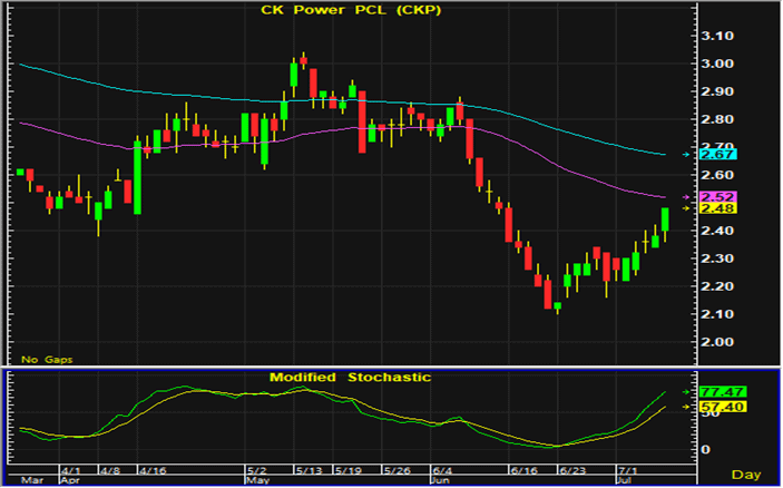 ราคาหุ้น CKP มีสัญญาณซื้อทางเทคนิคเกิดขึ้นในการซื้อขายสัปดาห์ก่อน และมีแนวโน้มที่จะปรับตัวขึ้นต่อ การเก็งกำไรระยะสั้นแนะนำเปิดสถานะซื้อใกล้แนวรับ 2.42-2.44 บาท และมีจุดขายตัดขาดทุนอยู่ที่บริเวณ 2.4 บาท