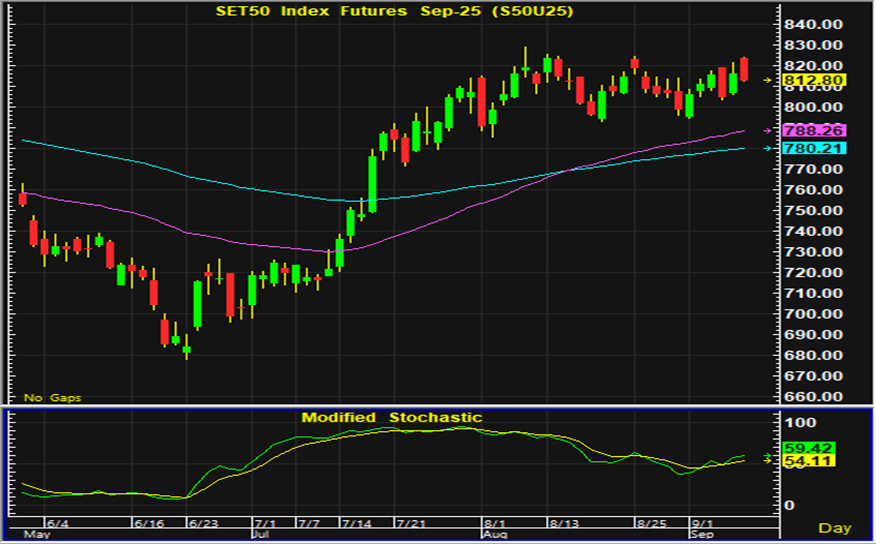 ดัชนีตลาดหุ้นไทยวานนี้ดีดตัวขึ้นช่วงเปิดตลาด ก่อนที่จะเริ่มอ่อนตัวลงในระหว่างวันและปิดตลาดปรับตัวลง หุ้นกลุ่มที่คาดว่าจะได้ประโยชน์จากมาตรการต่างๆที่รัฐบาลชุดใหม่เตรียมนำมาใช้ เป็นกลุ่มที่มีแรงซื้อเก็งกำไรเข้ามาอย่างต่อเนื่อง แต่ด้วยดัชนีตลาดหุ้นไทยซึ่งปรับตัวขึ้นมามากจึงเริ่มมีแรงขายทำกำไรกลับออกมา ประเด็นในประเทศทั้งรายชื่อคณะรัฐมนตรีชุดใหม่ มาตรการกระตุ้นเศรษฐกิจและนโยบายอื่นๆของรัฐบาล ยังเป็นประเด็นที่นักลงทุนให้ความสนใจ เช่นเดียวกับรายงานเงินเฟ้อของสหรัฐที่จะมีผลต่อการประเมินแนวโน้มดอกเบี้ยเป็นอีกหนึ่งปัจจัยที่จะส่งผลต่อการลงทุน ส่วนการเคลื่อนไหวของตลาดหุ้นไทยในระยะสั้นเริ่มมีสัญญาณเตือนการปรับฐาน หากดัชนีดีดตัวขึ้นในระหว่างวันควรระวังแรงขายที่คาดว่าจะมีกลับออกมา การเก็งกำไรในสัญญาเดือน U แนะนำรอเปิดสถานะซื้อใกล้แนวรับ 805-806 จุด และมีจุดขายตัดขาดทุนอยู่ที่ 803 จุด โดยมีแนวต้านสำหรับเก็งกำไรฝั่งขายอยู่ที่ 817-818 จุด และมีจุดปิดสถานะตัดขาดทุนอยู่ที่ 820 จุด