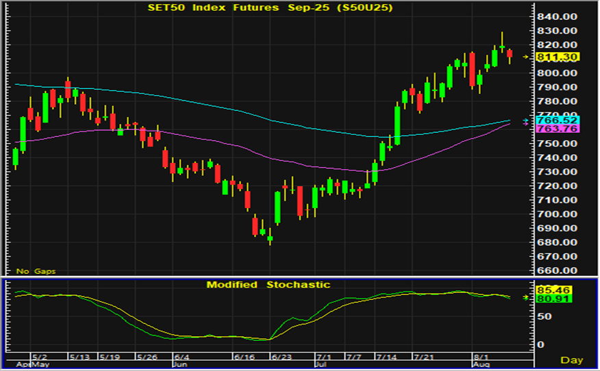 ดัชนีตลาดหุ้นไทยแกว่งตัวแคบก่อนที่จะปิดตลาดอ่อนตัวลงในการซื้อขายวันศุกร์ แต่ยังเป็นการปิดตลาดเพิ่มขึ้นต่อเนื่องเป็นสัปดาห์ที่ 7 ความคาดหวังเรื่องการลดดอกเบี้ยของสหรัฐหลังข้อมูลเศรษฐกิจในตลาดแรงงานมีสัญญาณชะลอตัวเป็นปัจจัยบวกต่อการลงทุน แต่ด้วยราคาหุ้นในหลายกลุ่มดีดตัวขึ้นต่อเนื่องติดต่อกันหลายสัปดาห์ รวมทั้งความไม่แน่นอนของนโยบายการค้าของรัฐบาลสหรัฐ การฟื้นตัวของตลาดหุ้นไทยช่วงปลายสัปดาห์ที่ผ่านมาจึงเริ่มอ่อนตัวลง ส่วนสัปดาห์นี้การเคลื่อนไหวของตลาดหุ้นไทยมีแนวโน้มแกว่งตัวแคบ และคาดว่าจะมีการปรับฐานเกิดขึ้น ประเด็นการเมืองในประเทศจากการพิจารณาคดีของบุคคลที่เกี่ยวข้องกับรัฐบาล รวมทั้งรายงานผลประกอบการไตรมาส 2 เป็นประเด็นที่นักลงทุนให้ความสนใจ การเก็งกำไรในสัญญาเดือน U แนะนำรอเปิดสถานะซื้อใกล้แนวรับบริเวณ 802-803 จุด และมีจุดขายตัดขาดทุนอยู่ที่ 800 จุด โดยมีแนวต้านสำหรับเก็งกำไรฝั่งขายอยู่ที่ 817-818 จุด และมีจุดปิดสถานะตัดขาดทุนอยู่ที่ 820 จุด