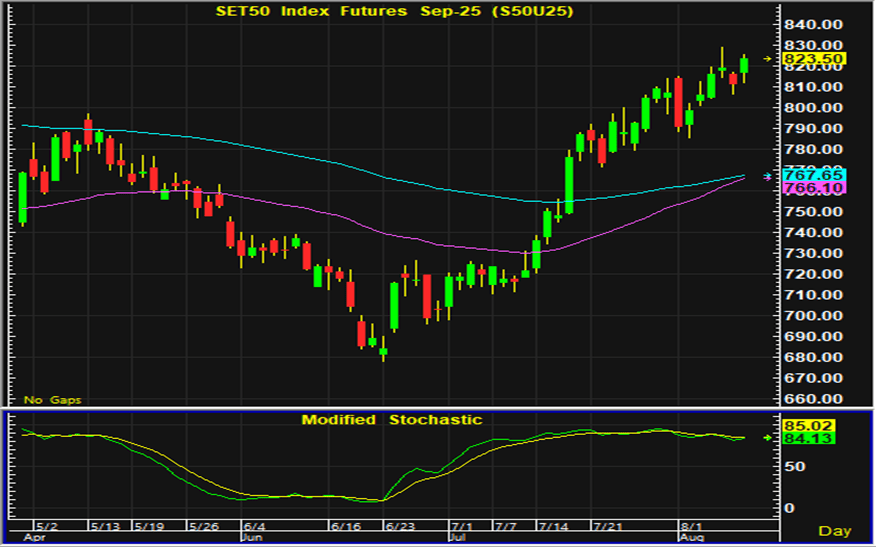 ดัชนีตลาดหุ้นไทยปิดตลาดเพิ่มขึ้นตามทิศทางตลาดหุ้นต่างประเทศ ความคาดหวังเรื่องการลดดอกเบี้ยของธนาคารกลางสหรัฐ รวมทั้งการขยายเวลาในการเจรจาการค้าระหว่างสหรัฐและจีนเป็นปัจจัยบวกต่อการลงทุน ขณะที่การประชุมของคณะกรรมการนโยบายการเงินของไทยซึ่งมีมติลดดอกเบี้ยลงร้อยละ 0.25 เป็นอีกหนึ่งปัจจัยบวกต่อการเคลื่อนไหวของตลาดหุ้นไทย การเคลื่อนไหวของตลาดหุ้นไทยในภาพรวมแม้จะกลับมาเคลื่อนไหวในทิศทางฟื้นตัว แต่ด้วยราคาหุ้นในหลายกลุ่มที่ปรับขึ้นมามาก ในระยะสั้นควรระวังแรงขายทำกำไรที่คาดว่าจะมีกลับออกมา ประเด็นเกี่ยวกับการเมืองในประเทศแล้ว รวมทั้งรายงานข้อมูลเศรษฐกิจของสหรัฐที่ส่งผลต่อการประเมินทิศทางดอกเบี้ย ยังคงเป็นประเด็นที่นักลงทุนให้ความสนใจ การเก็งกำไรในสัญญาเดือน U แนะนำรอเปิดสถานะซื้อใกล้แนวรับบริเวณ 817-818 จุด และมีจุดขายตัดขาดทุนอยู่ที่ 815 จุด โดยมีแนวต้านสำหรับเก็งกำไรฝั่งขายอยู่ที่ 827-828 จุด และมีจุดปิดสถานะตัดขาดทุนอยู่ที่ 830 จุด