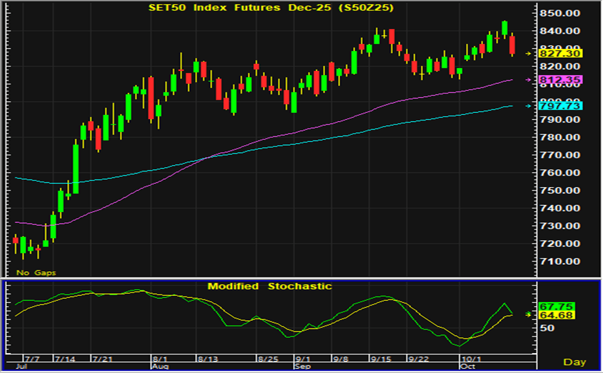ดัชนีตลาดหุ้นปิดตลาดปรับตัวลงตามแรงขายหุ้นขนาดใหญ่ในกลุ่มชิ้นส่วนอิเลคทรอนิคส์ และส่งผลให้ดัชนีปิดตลาดปรับตัวลงจากระดับปิดของสัปดาห์ก่อนหน้า ประเด็นในประเทศเรื่องการกระตุ้นเศรษฐกิจของรัฐบาลเป็นปัจจัยบวกต่อการเคลื่อนไหวของตลาดหุ้นไทย ขณะที่ปัญหาการคลังของรัฐบาลสหรัฐเป็นประเด็นกดดันการลงทุน ส่วนสัปดาห์นี้ปัญหาการค้าระหว่างประเทศเป็นปัจจัยลบที่กลับมากดดันการลงทุน หลังสหรัฐเตือนว่าอาจเพิ่มภาษีนำเข้าสินค้าจากจีนเพื่อตอบโต้การที่จีนจำกัดการส่งออกแร่หายากไปยังสหรัฐ ซึ่งต้องรอติดตามความชัดเจนว่าสหรัฐจะใช้อัตราภาษีสูงตามที่ระบุหรือไม่ ส่วนประเด็นในประเทศซึ่งคาดว่าสัปดาห์นี้จะมีความชัดเจนเรื่องการกระตุ้นเศรษฐกิจในภาคท่องเที่ยว ซึ่งจะเป็นปัจจัยบวกต่อหุ้นที่เกี่ยวข้องต่อไปการเก็งกำไรในสัญญาเดือน Z มีแนวรับสำหรับเปิดสถานะซื้อเก็งกำไรอยู่ที่บริเวณ  817-818 จุด และมีจุดขายตัดขาดทุนอยู่ที่ 815 จุด โดยมีแนวต้านสำหรับเปิดสถานะขายอยู่ที่ 832-833 จุด และมีจุดปิดสถานะตัดขาดทุนอยู่ที่ 835 จุด