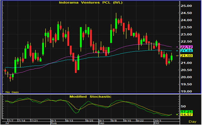 ราคาหุ้น IVL เริ่มฟื้นตัวในช่วงปลายสัปดาห์ที่ผ่านมา และมีสัญญาณซื้อเกิดขึ้นจากเครื่องมือทางเทคนิค การเก็งกำไรฝั่งซื้อมีแนวรับสำหรับเปิดสถานะอยู่ที่บริเวณ 21.1-21.2 บาท และมีจุดขายตัดขาดทุนอยู่ที่ 20.8 บาท