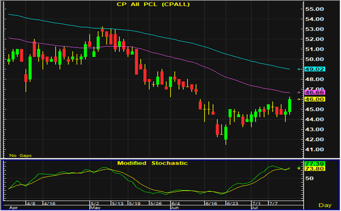 ราคาหุ้น CPALL ปิดตลาดเพิ่มขึ้นในปริมาณมากในการซื้อขายวานนี้ การเคลื่อนไหวทางเทคนิคในระยะสั้นจึงยังมีแนวโน้มฟื้นตัว และสามารถเปิดสถานะซื้อเก็งกำไรใกล้แนวรับบริเวณ 45.25-45.5 บาท โดยมีจุดขายตัดขาดทุนอยู่ที่ 44.5 บาท