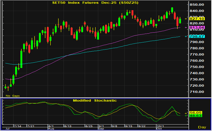 ดัชนีตลาดหุ้นไทยวานนี้มีแรงซื้อกลับเข้ามาตั้งแต่ช่วงเปิดตลาด และในระหว่างวันแรงซื้อที่ยังมีเข้ามาอย่างต่อเนื่อง จนทำให้ดัชนีปิดตลาดเพิ่มขึ้นในปริมาณมาก การกระตุ้นเศรษฐกิจของรัฐบาลกลับมาเป็นปัจจัยบวกต่อการลงทุน ขณะที่ปัจจัยต่างประเทศทั้งปัญหาการคลังของสหรัฐ รวมทั้งประเด็นการค้าระหว่างประเทศ ยังเป็นประเด็นที่นักลงทุนให้ความสนใจ และอาจกลับมาเป็นปัจจัยกดดันการลงทุน การเคลื่อนไหวของตลาดหุ้นไทยในภาพรวมเคลื่อนไหวในทิศทางฟื้นตัว แต่ด้วยราคาหุ้นในหลายกลุ่มซึ่งปรับตัวขึ้นมาพอสมควร ในระยะสั้นจึงอาจมีการปรับฐาน หุ้นกลุ่มกลุ่มค้าปลีก กลุ่มท่องเที่ยว รวมทั้งกลุ่มที่ได้ประโยชน์จากการกระตุ้นเศรษฐกิจของรัฐบาล ยังเป็นกลุ่มที่คาดว่าจะมีแรงซื้อกลับเข้ามา การเก็งกำไรในสัญญาเดือน Z มีแนวรับสำหรับเปิดสถานะซื้อเก็งกำไรอยู่ที่บริเวณ 823-824 จุด และมีจุดขายตัดขาดทุนอยู่ที่ 820 จุด โดยมีแนวต้านสำหรับเปิดสถานะขายอยู่ที่ 835-836 จุด และมีจุดปิดสถานะตัดขาดทุนอยู่ที่ 838 จุด
