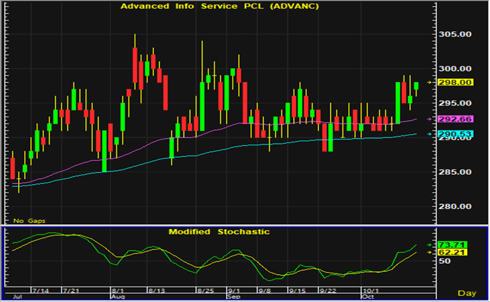 ราคาหุ้น ADVANC ปิดตลาดเพิ่มขึ้นเป็นวันที่ 2 และยังมีแนวโน้มที่จะปรับตัวขึ้นต่อ การเก็งกำไรระยะสั้นแนะนำเปิดสถานะซื้อใกล้แนวรับบริเวณ 295-296 บาท และมีจุดขายตัดขาดทุนอยู่ที่ 293 บาท